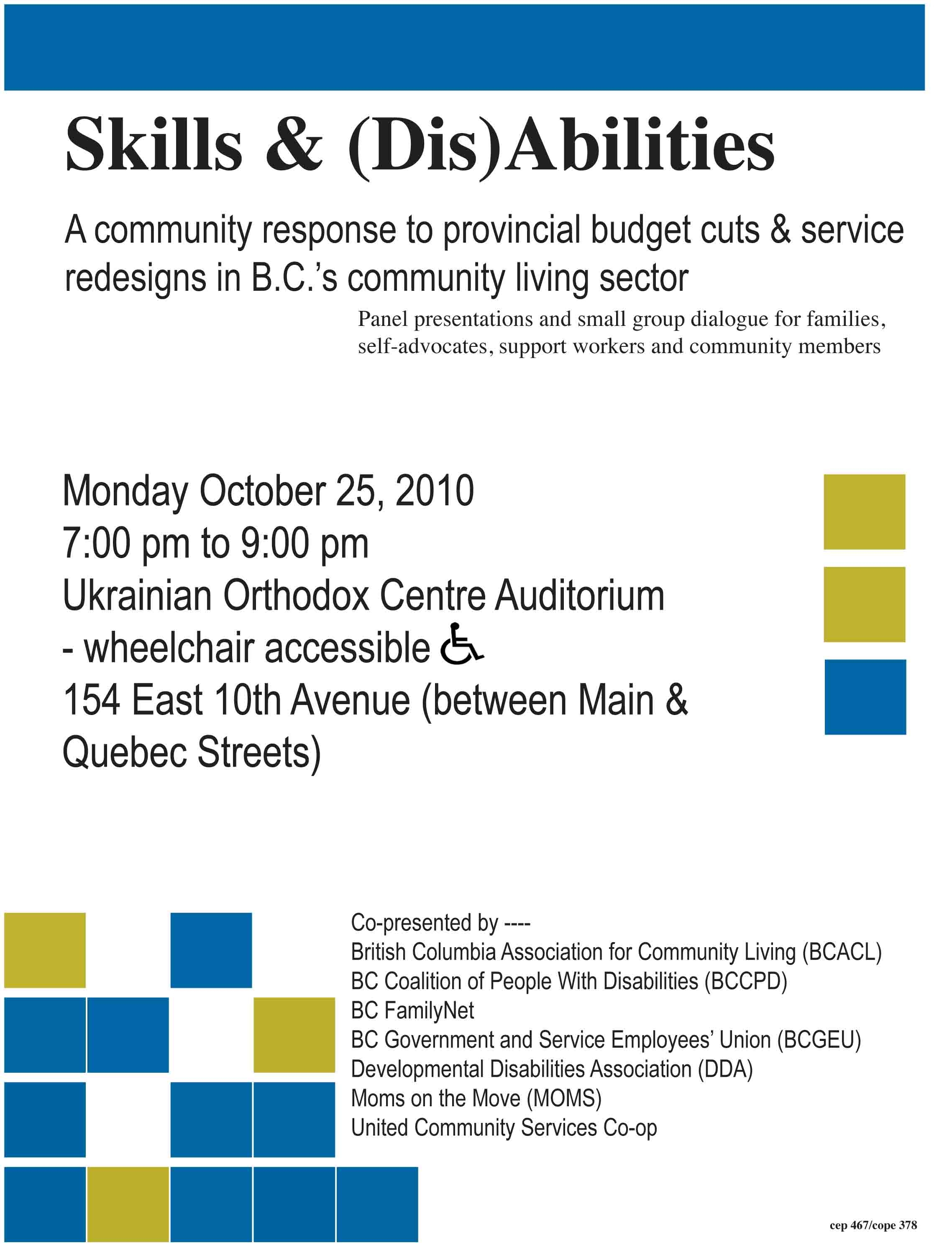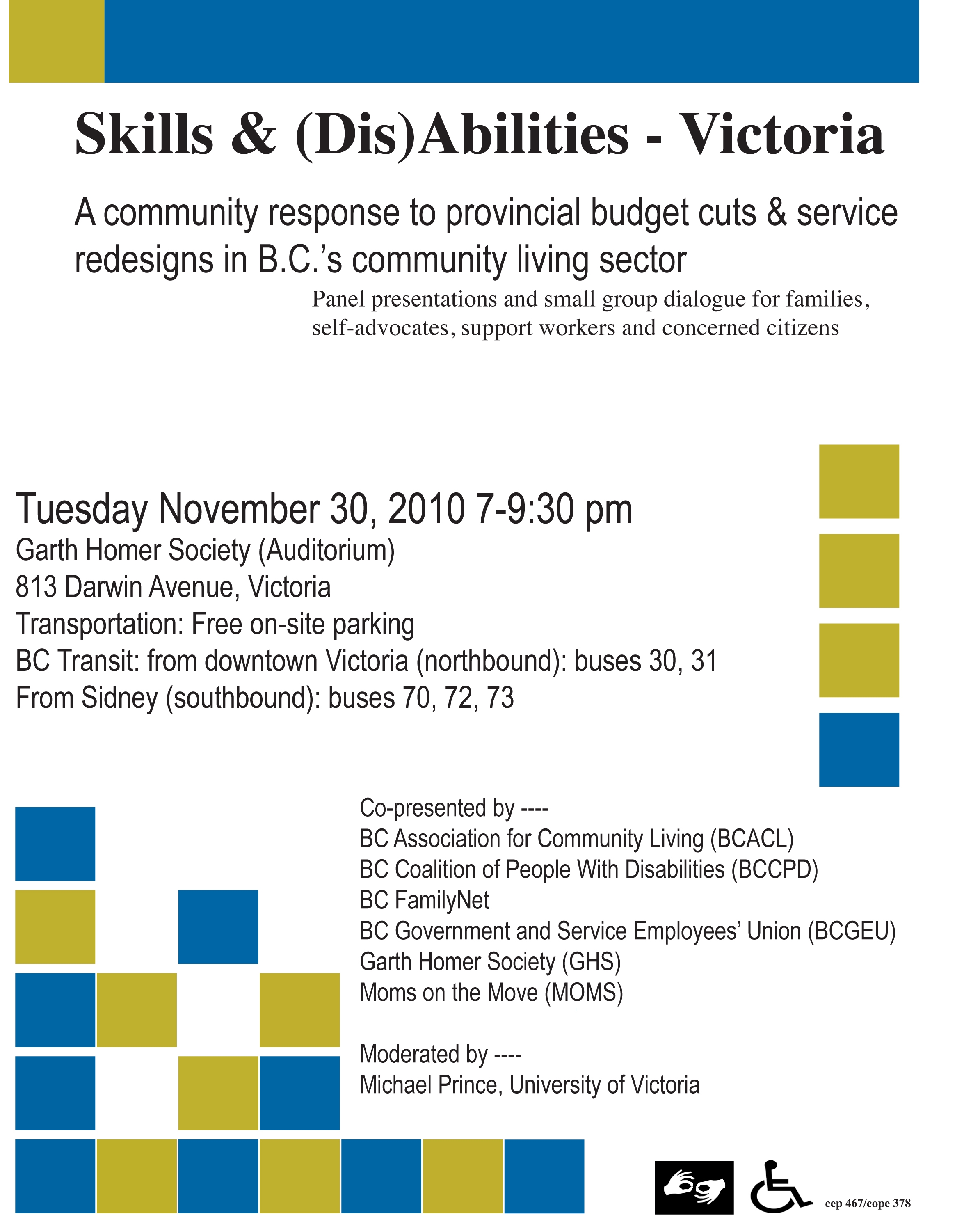 A summary of the meetings – including panellist’s remarks, group dialogue sessions, and recommendations – is detailed in the report: Reaching Out/Weighing In: Report on the Skills & (Dis)Abilities Meetings to Address the Community Living Crisis in BC